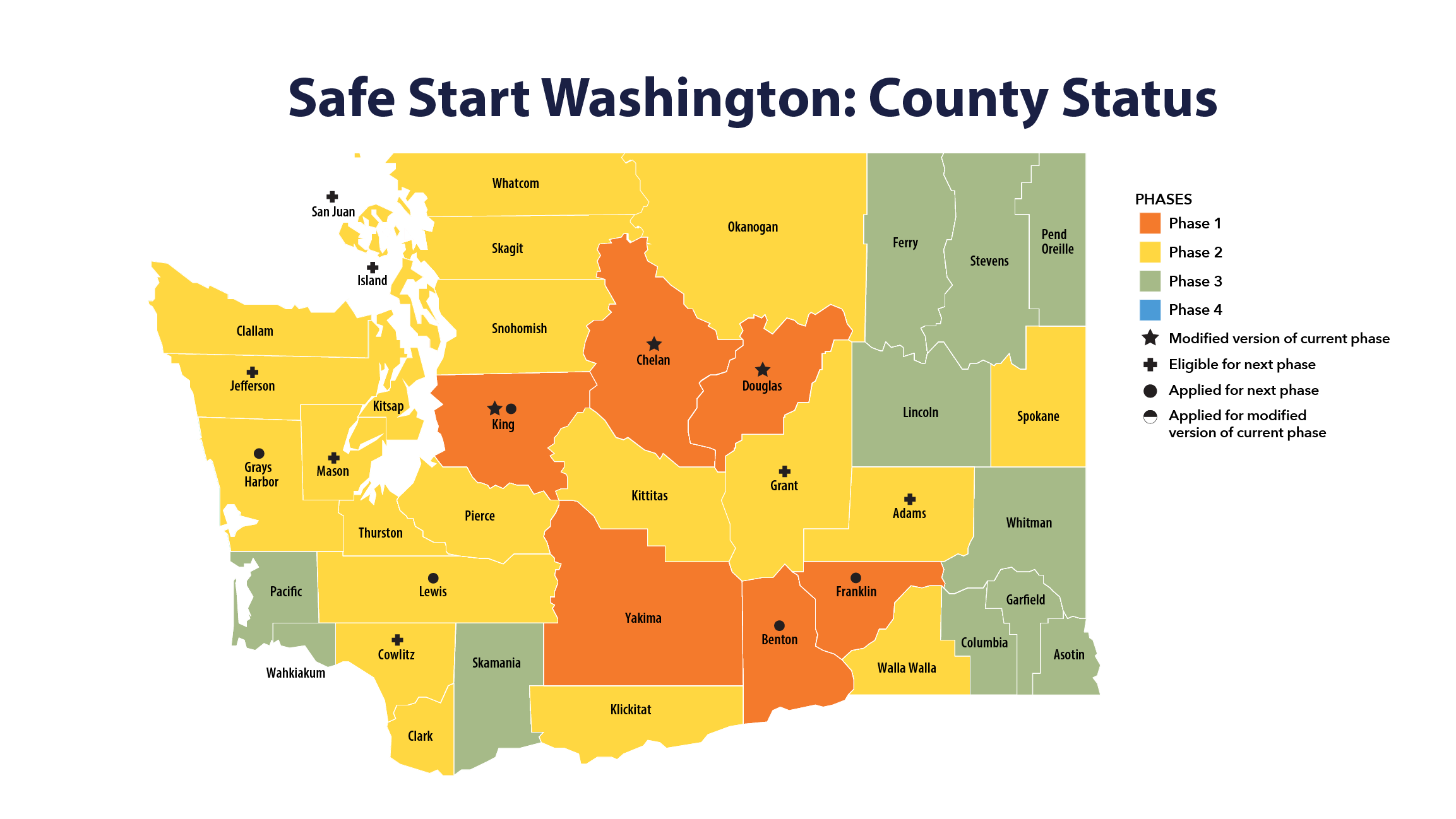 Per Governor Jay Inslee’s phased reopening plan, cases of the virus need be below 25 per 100,000 people over a two week period before a County can be considered for ‘Phase 2’, which allows businesses like restaurants and retail stores to open at partial capacity. As of mid-June, Yakima, Benton, Franklin, Chelan, Douglas and King Counties all remained in phase one, or a modified phase one.