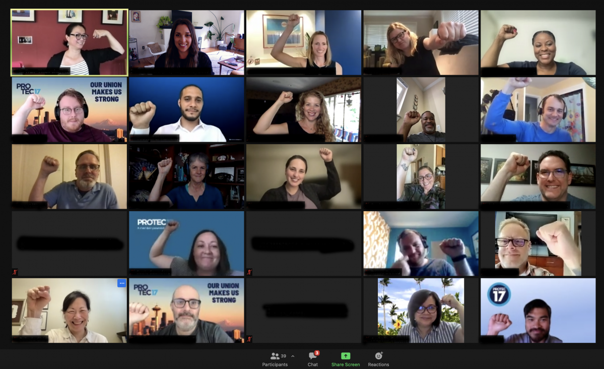 PWR is a core group of members who are focused on racial, social, and economic justice in union-wide and community-based issues. In the spring meeting, PWR member and King County Chapter President Lucas Smith (pictured, next page) shared some of the highs and lows of contract negotiations so far at the County, which began late in 2020. Knowing that many local governments are considering austerity measures in the wake of the pandemic, and that many PROTEC17 contracts would be open for negotiations this year, PWR decided to make contract campaining a high priority for the group.