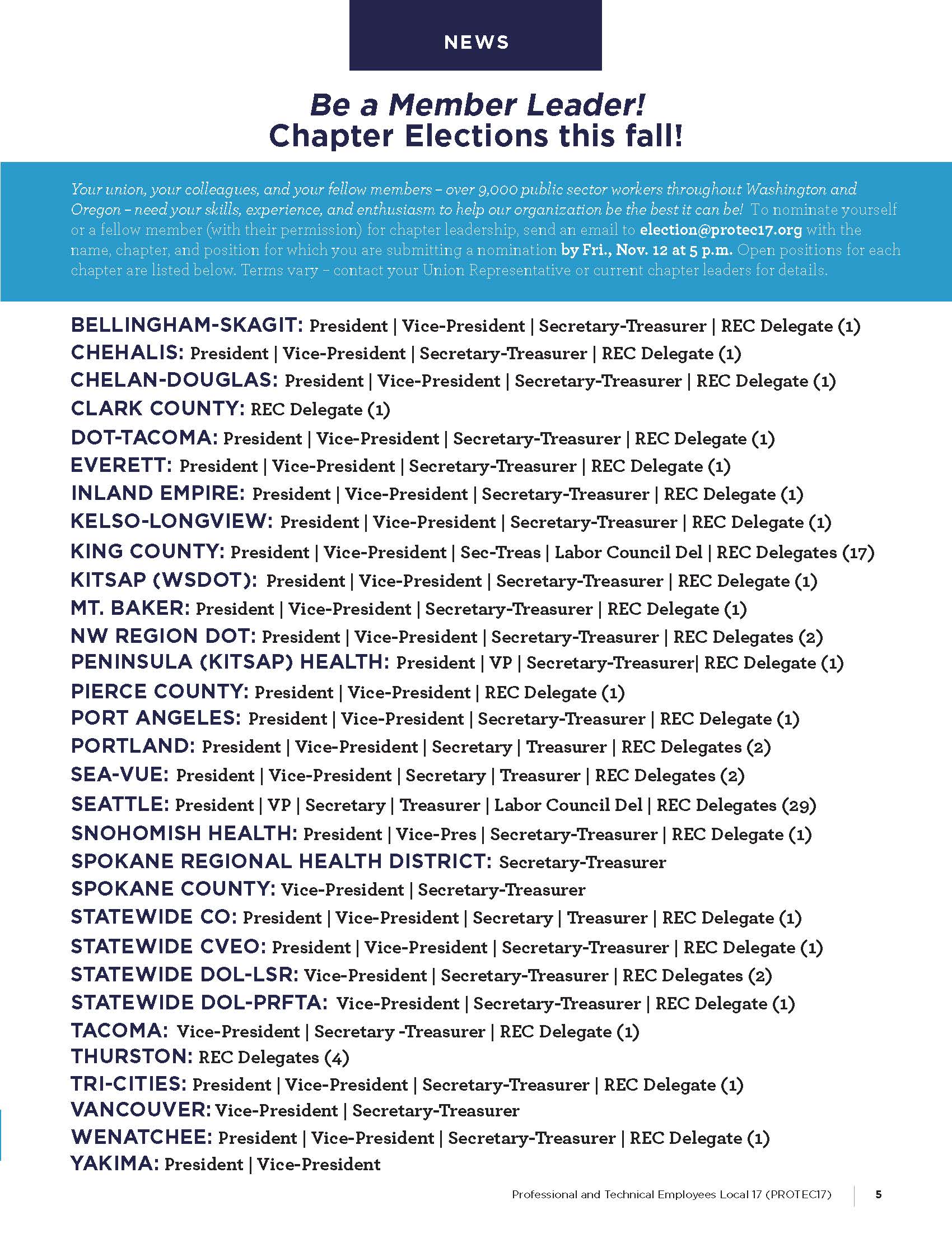 Your union, your colleagues, and your fellow members – over 9,000 public sector workers throughout Washington and Oregon – need your skills, experience, and enthusiasm to help our organization be the best it can be! To nominate yourself or a fellow member (with their permission) for chapter leadership, send an email to with the name, chapter, and position for which you are submitting a nomination by Fri., Nov. 12 at 5 p.m. Open positions for each chapter are listed below. Terms vary – contact your Union Representative or current chapter leaders for details.