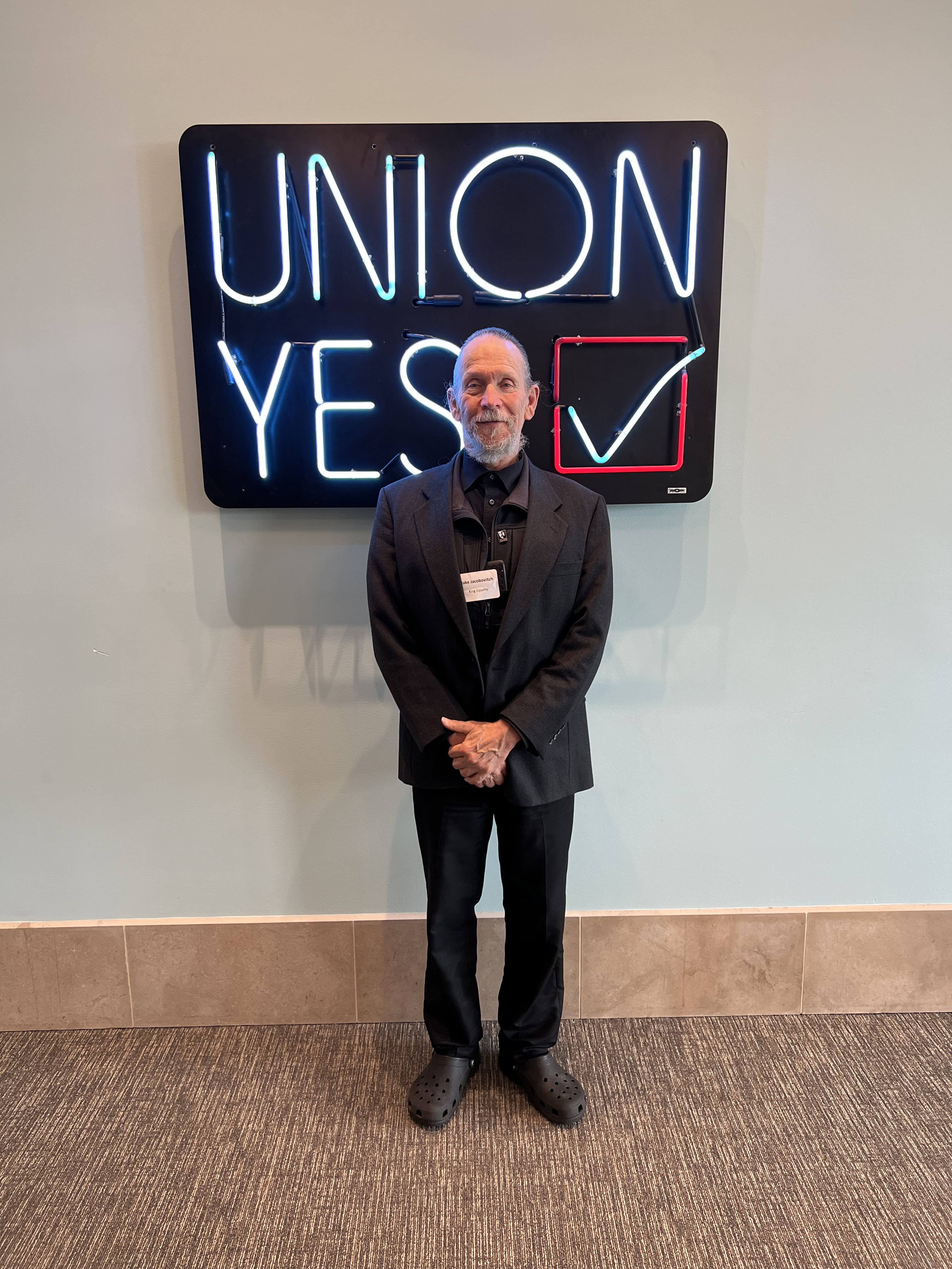 Gold Card recipient Jake Jacobovitch poses for a picture at the REC meeting at the Seattle Labor Temple.