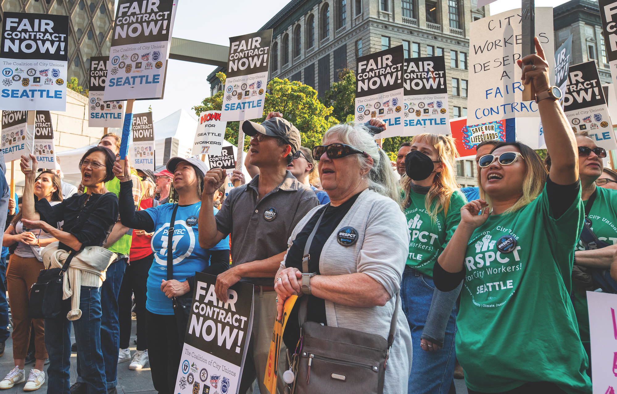 At the Rally for #RSPCT, organized by PROTEC17 and the Coalition of City Unions (CCU), attendees stood in solidarity to demand an equitable contract for city workers with provisions to ensure safe workplaces, and wages that keep up with the cost of living. The CCU represents Seattle city workers from multiple unions, including: PROTEC17, LiUNA/Laborers Local 242, AFSCME Council 2, Local 104, Seattle Dispatchers Guild, Sheet Metal Workers Local 66, IIBEW Local 46, IAM District 160, Teamsters 117, Teamsters 763, IATSE Local 15, Painters/IUPAT District Council 5, IIUOE Local 302, Inlandboatmen’s Union, Court Marshal’s Guild, and UNITE HERE! Local 8.