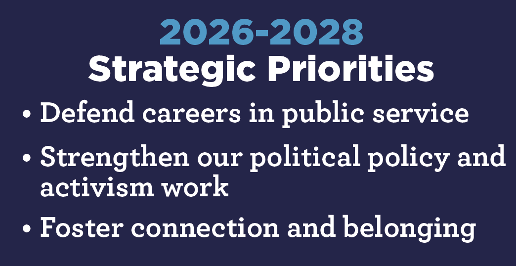 Since then, the Strategic Planning Committee has been combing through all of this input to form new priorities, goals, and objectives for our union. Several themes emerged during this process, and three priorities rose to the surface. They are: Defend careers in public service; Strengthen our political policy and activism work, and; Foster connection and belonging.
