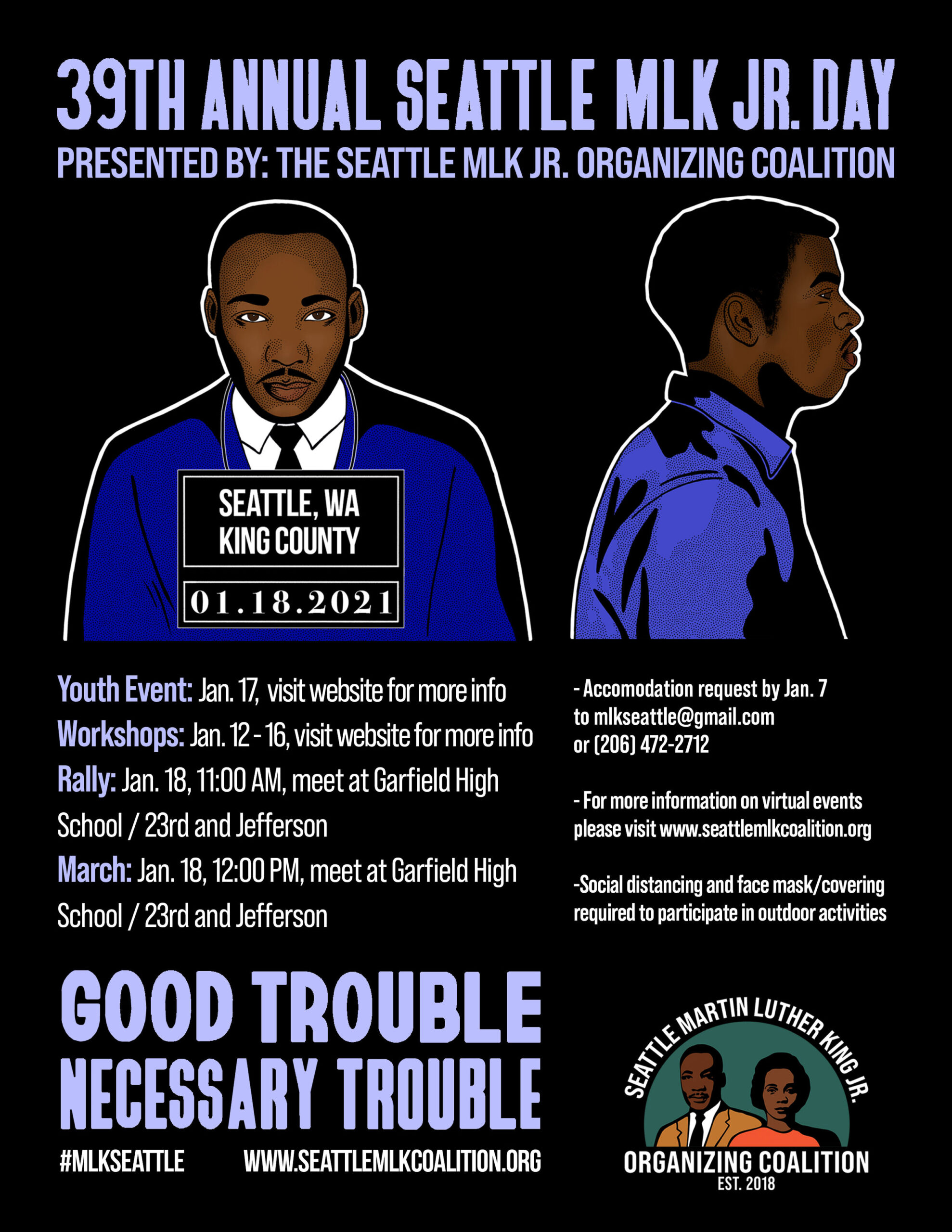 Join your fellow PROTEC17 members at the 2021 MLK Rally and March on Mon., Jan. 18. The 39th annual event is organized by the Seattle MLK Jr. Organizing Committee. Please wear your mask and meet us near the flagpole at Garfield High School at 11 a.m. — look for our PROTEC17 signs. The rally is from 11am-12pm, and the march starts at 12pm. See you there!