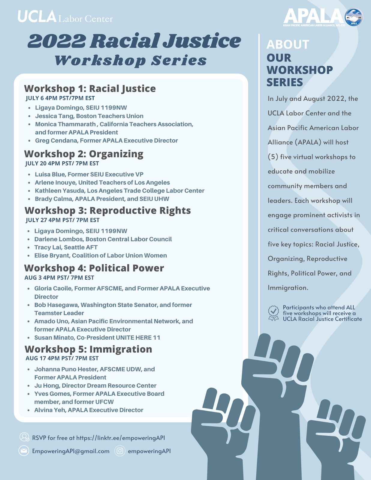 In collaboration with the UCLA Labor Center and Asian Pacific American Labor Alliance, the Asian Pacific American Labor Alliance (APALA) will be hosting five virtual workshops between July and August 2022 for a Racial Justice Workshops Series. The purpose of these workshops are is to educate and mobilize folks in the community and across the nation across key topics: racial justice, organizing, reproductive rights, political power, and immigrant rights.