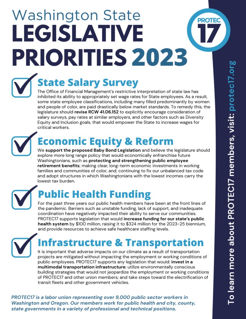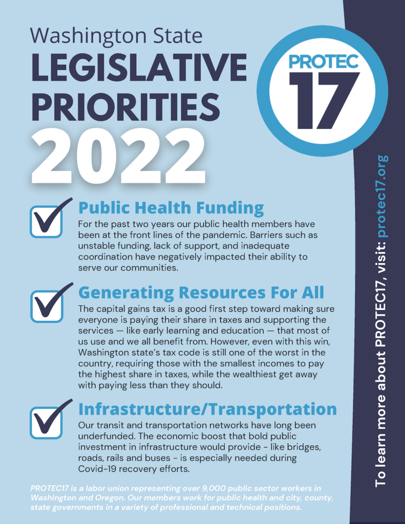 Each year, PROTEC17 members focus their energy on several policy and funding priorities during the State Legislative sessions in both Washington and Oregon. Guided by these priorities, we support legislation that lifts up the work of PROTEC17 members (transportation, public health, etc.), union rights, and/or broader worker issues that directly impact the lives of PROTEC17 members.