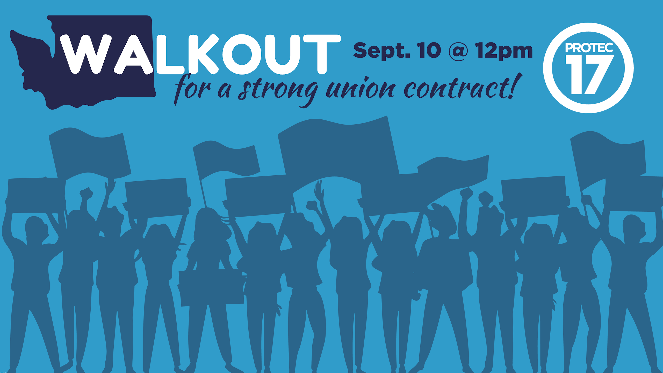We will be joining forces with other State employee unions on Sep. 10 at 12 p.m. as union members throughout the State walk off the job in solidarity. The action will take place during your lunch break to send the message that we will NOT allow the budget to be balanced on the backs of State employees! Union members will gather at specific locations. If you are planning to attend, please RSVP with us so we can coordinate on swag and signage! If you’re unable to make it to a designated spot, grab lunch with your colleagues, sport your PROTEC17 swag, and take some selfies! You can tag us on social media an #WalkoutforWashington!