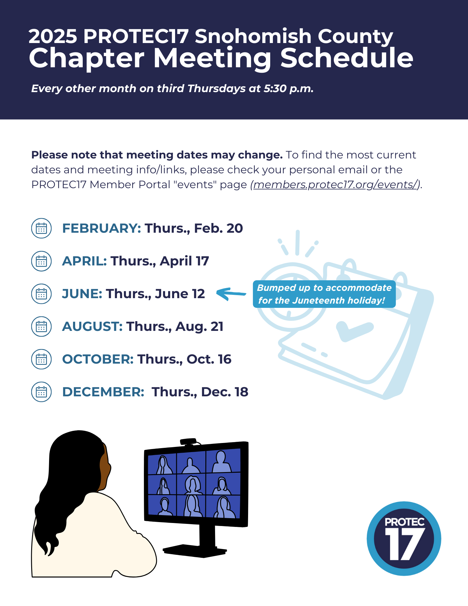 Yesterday, we had our first round of contract negotiations with Snohomish County. As I’ve mentioned in a few of our previous Chapter meetings and communications, Snohomish County is a new employer for PROTEC17, and much of this year’s negotiations will be centered on integrating your previous Health District contract into this new ecosystem.