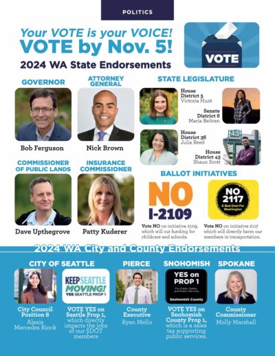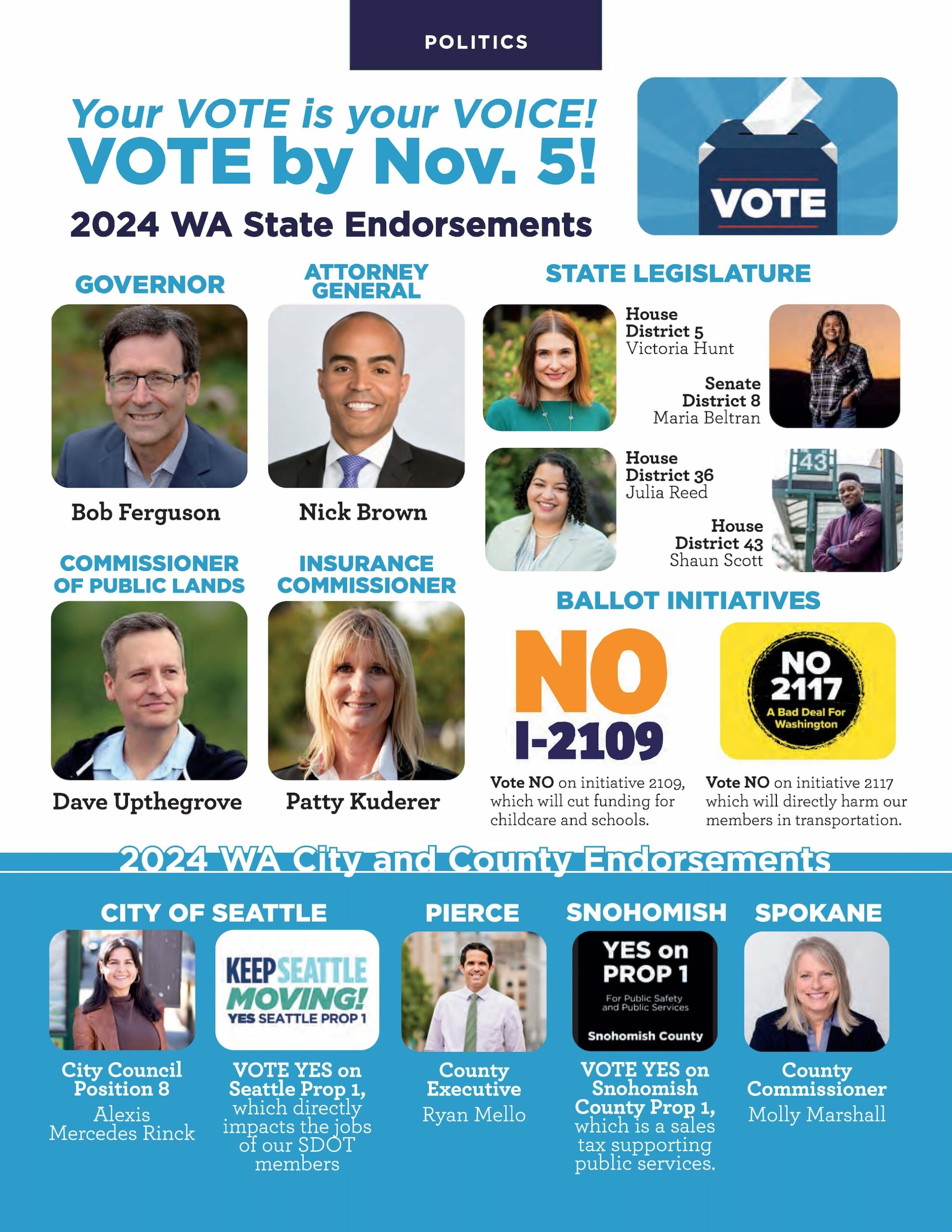 The PROTEC17 Workers’ Roundtable (PWR) has interviewed many candidates for state and local races throughout Washington state. Below you will find a list of Labor-, public-sector-, and worker-friendly candidates who we have endorsed for races in November 2024. Remember to vote by Nov. 5!
